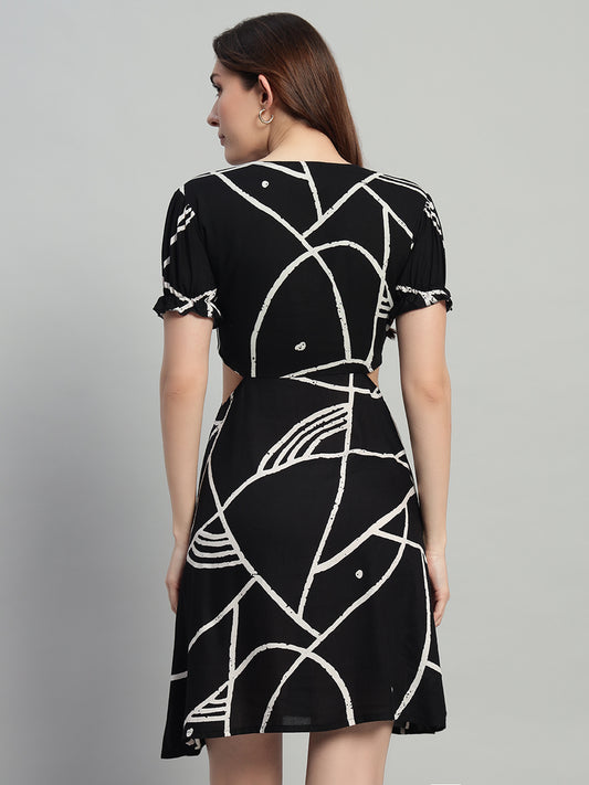 Women Black Abstract Short Flared Dress