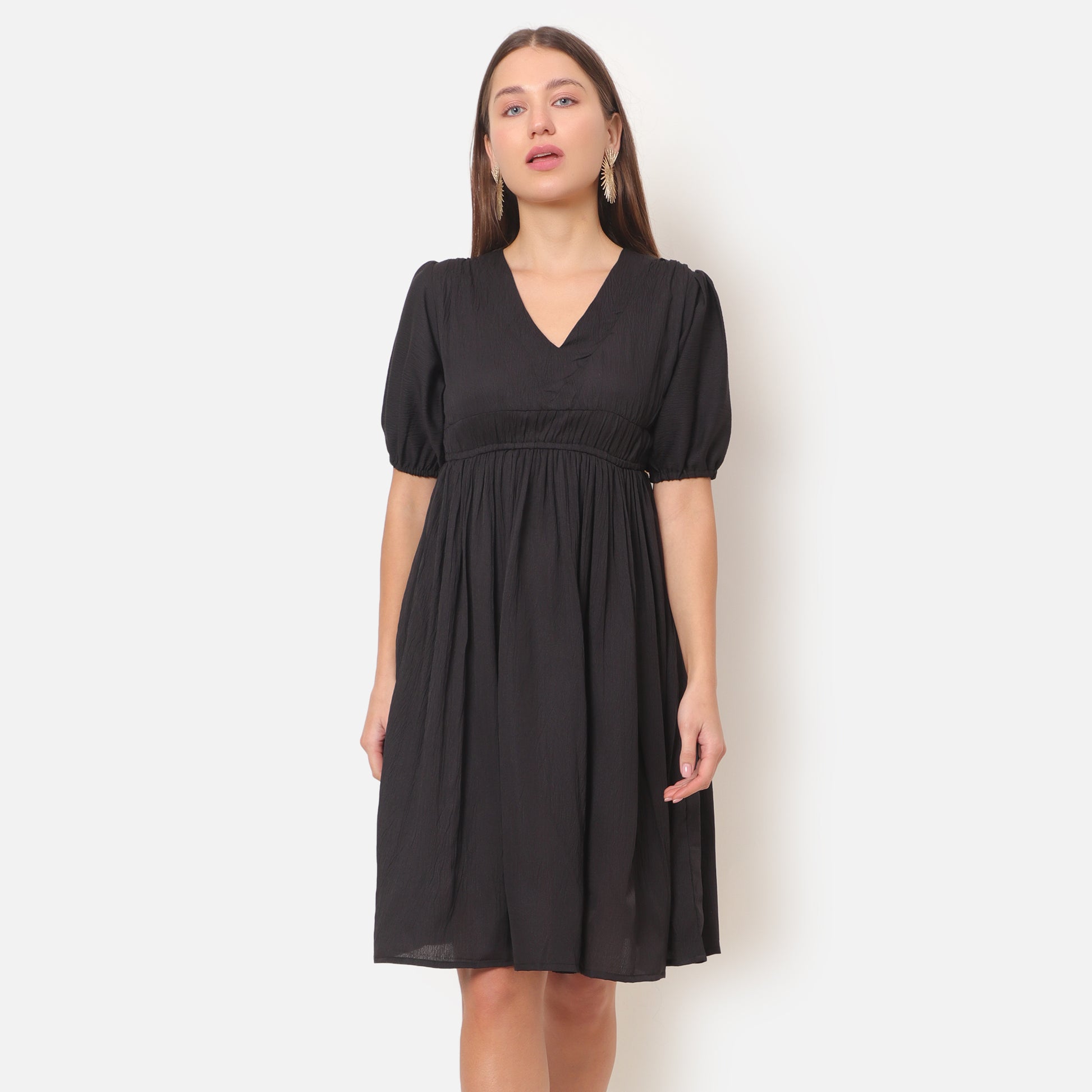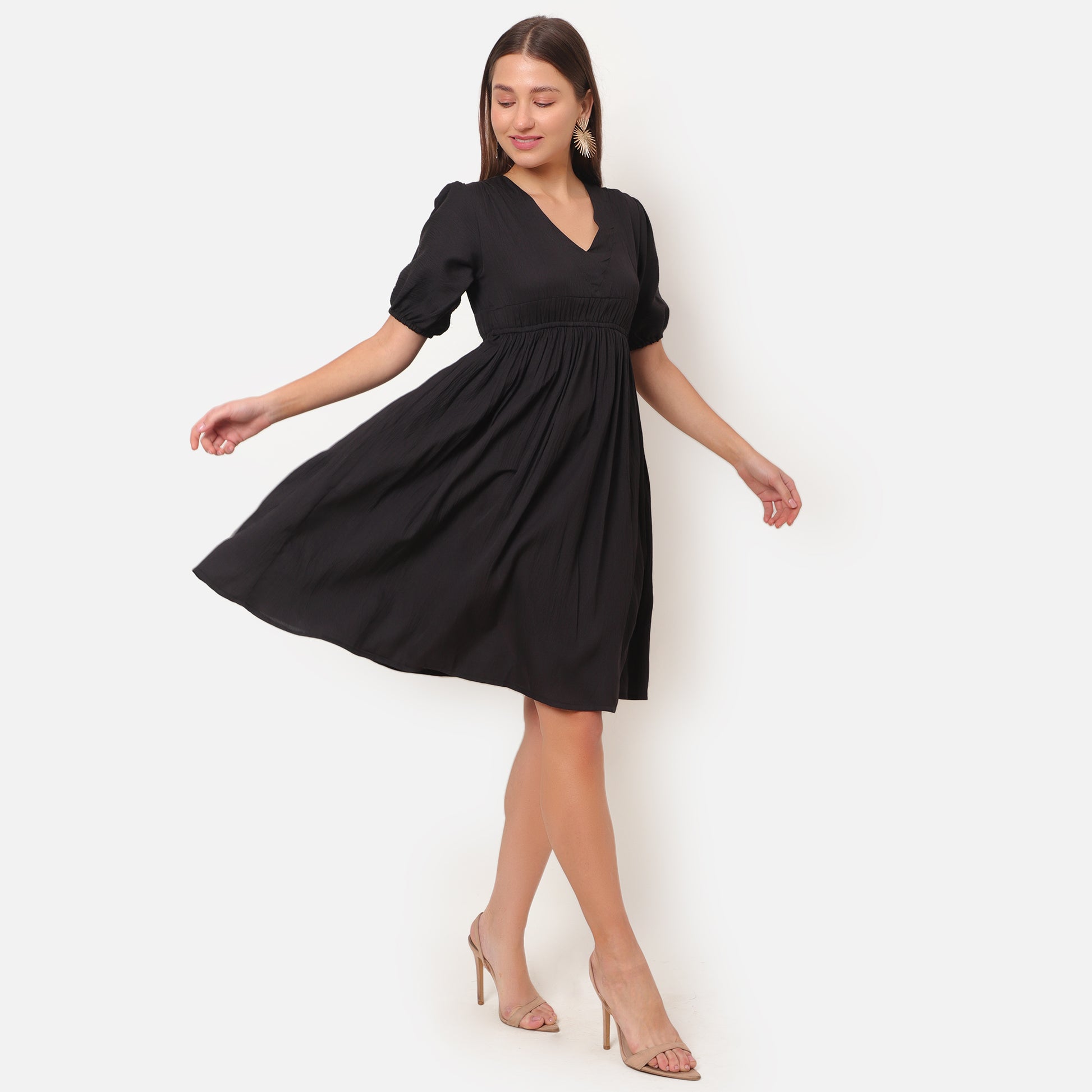 Elevate your party look with our Women A-line Midi Dress. Made with lightweight delta fabric, this dress features elegant balloon sleeves and a flattering V-neck. The A-line silhouette and gathered elastic waist provide a comfortable and stylish fit for any occasion. Perfect for a polished and effortless look.
