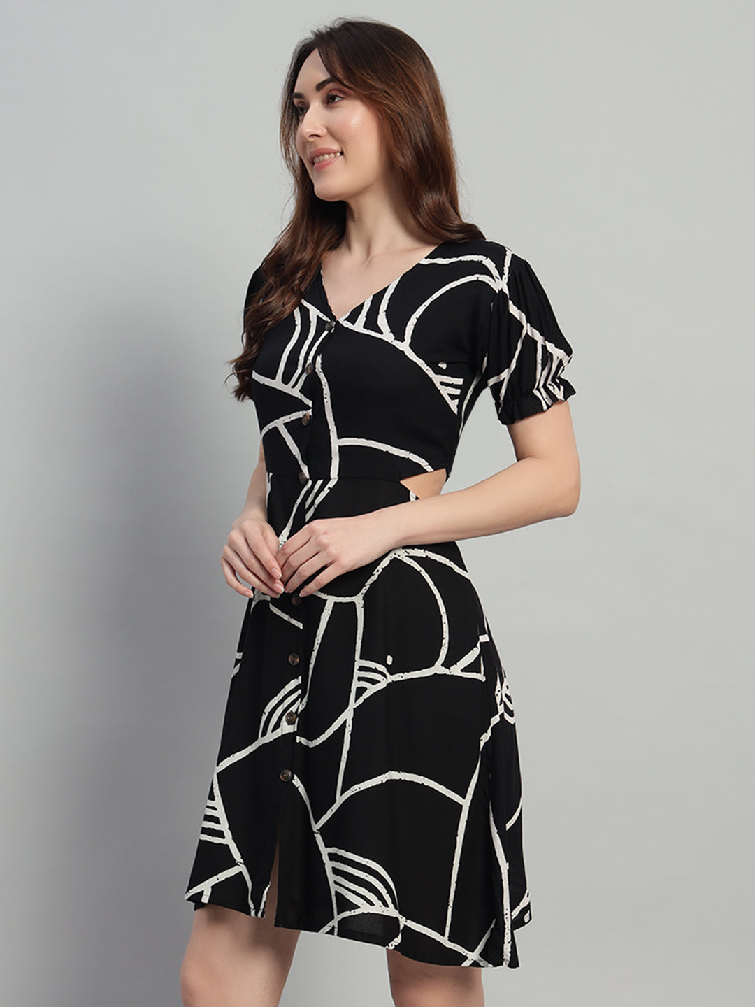 Women Black Abstract Short Flared Dress