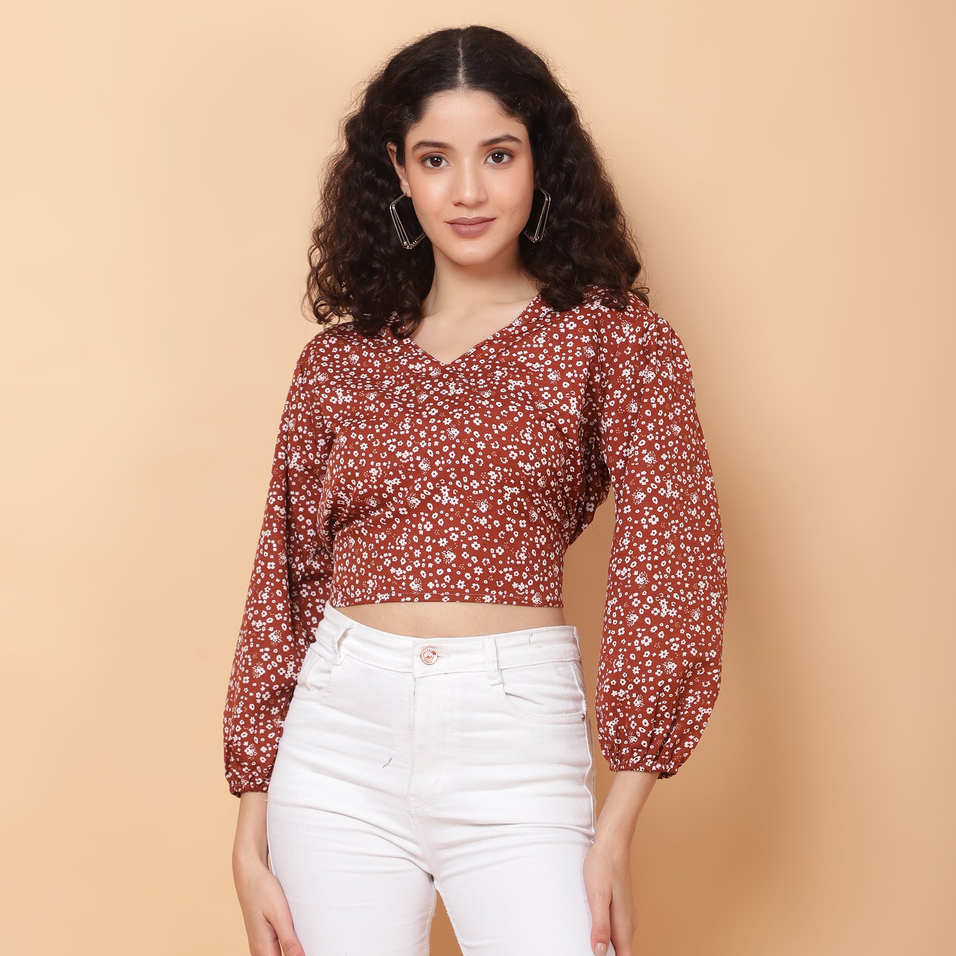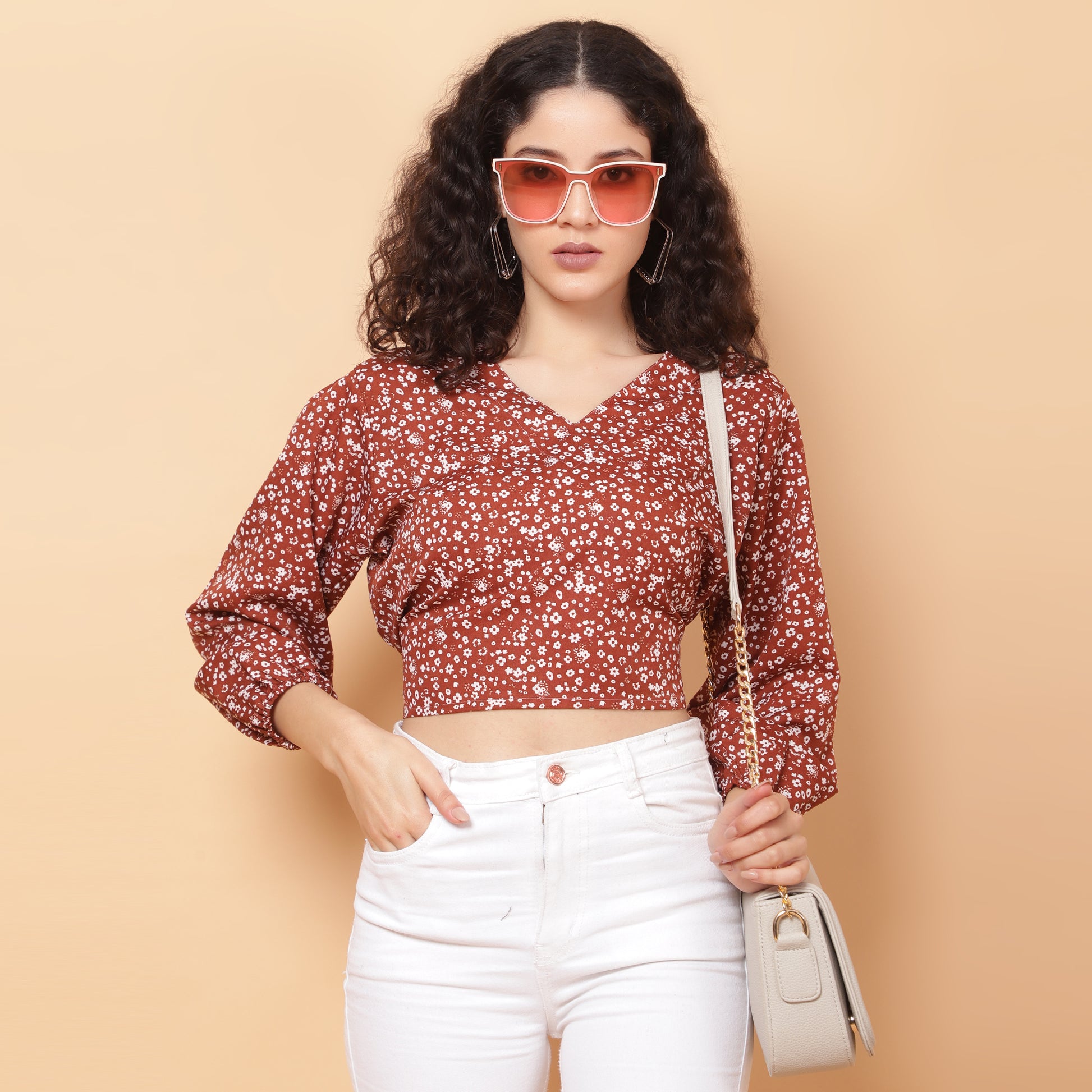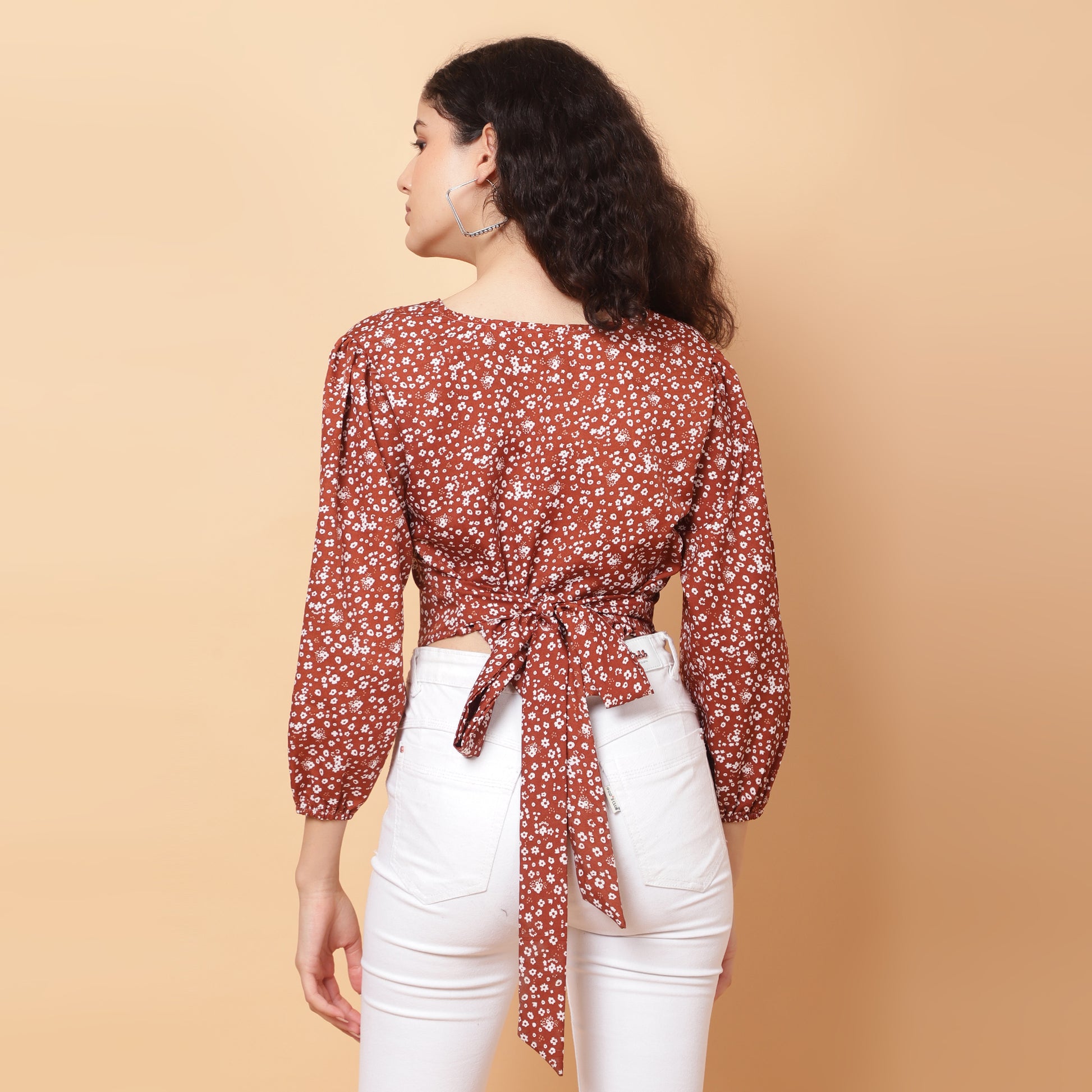 Rust V-Neck Crop Top, in Soft Crepe Fabric, Crop Length, No Closure, V-Neck, Three Quarter Sleeves. The Crop Top has a Knot detail which can be tied up at front or back.