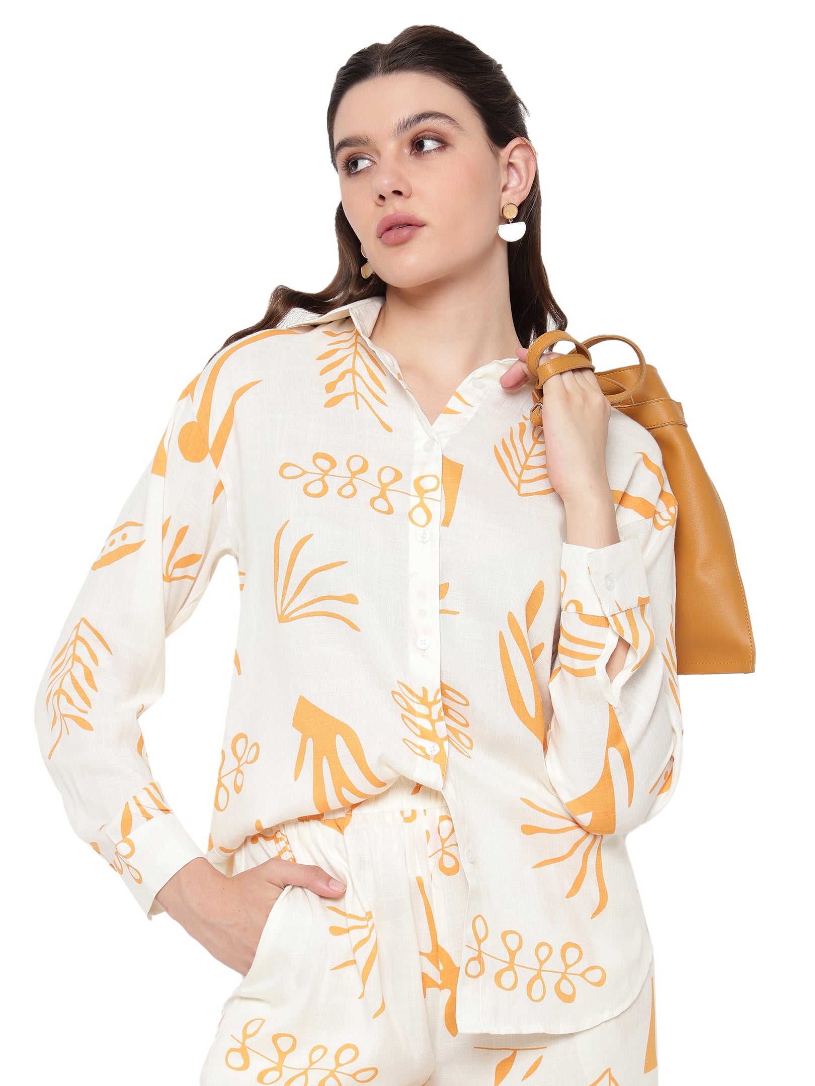 Get ready to be a fashionista with this white and yellow printed shirt plazzo co-ords set! Made of soft cotton, it features a playful yellow print, a classic collar, full sleeves and a comfortable fit. Time to slay in style! ;)